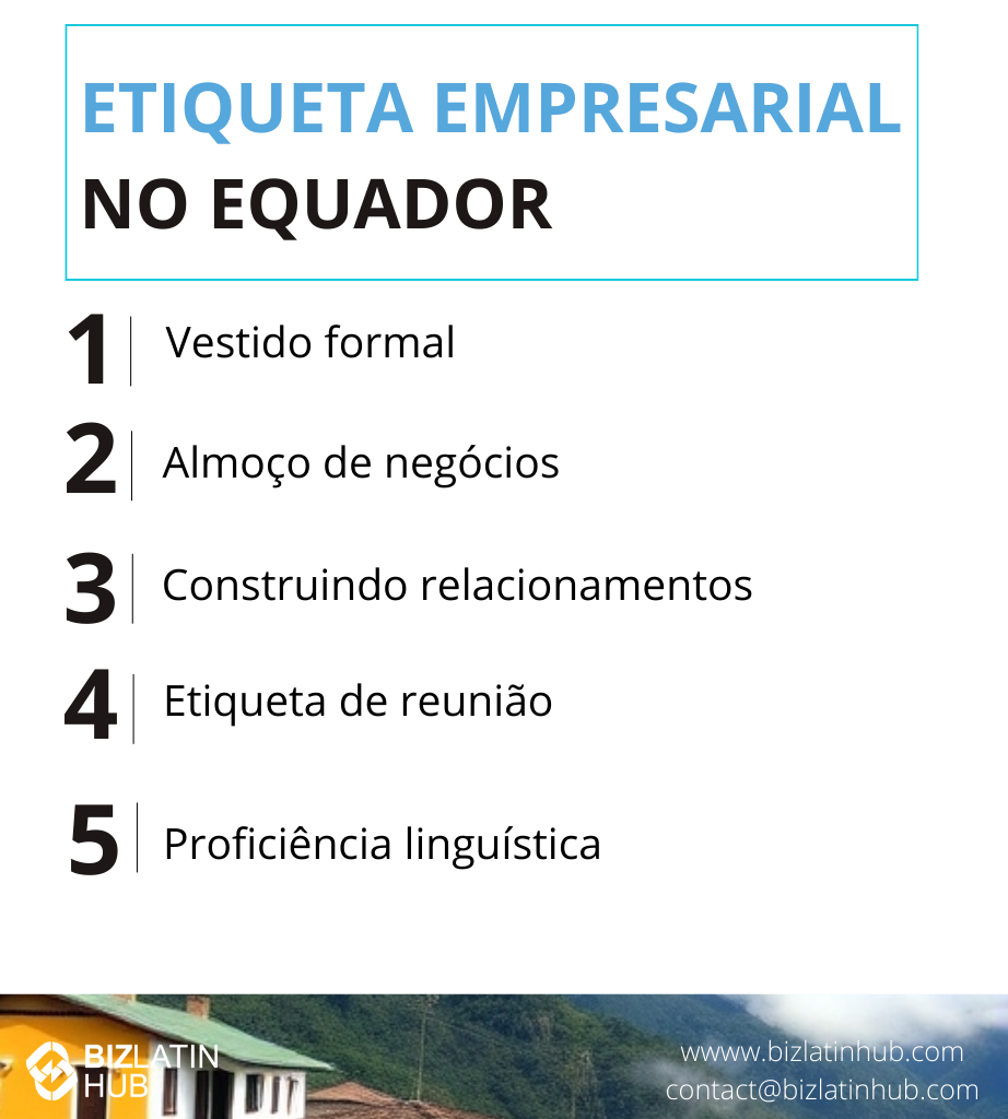 A cultura de negócios do Equador é formal, principalmente nos setores tradicionais e nas grandes cidades como Quito e Cuenca. Sempre use títulos, vista-se profissionalmente e siga a etiqueta formal em reuniões e comunicações escritas.