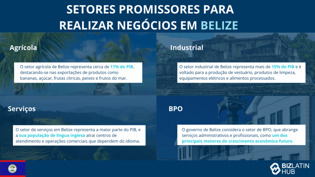 Setores fortes em Belize | Belize também tem um setor industrial considerável para seu tamanho e um setor agrícola particularmente grande. O setor bancário e o comércio internacional também são fundamentais. |