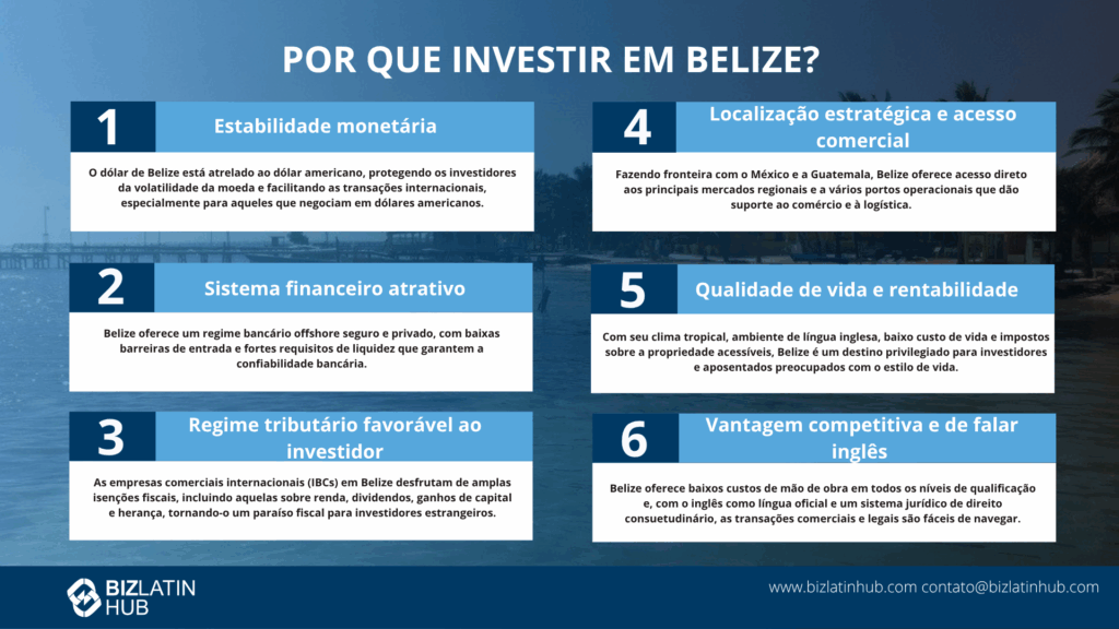 Para qualquer pessoa interessada em investir na América Latina ou no Caribe, os sete motivos a seguir tornam os negócios em Belize particularmente atraentes: