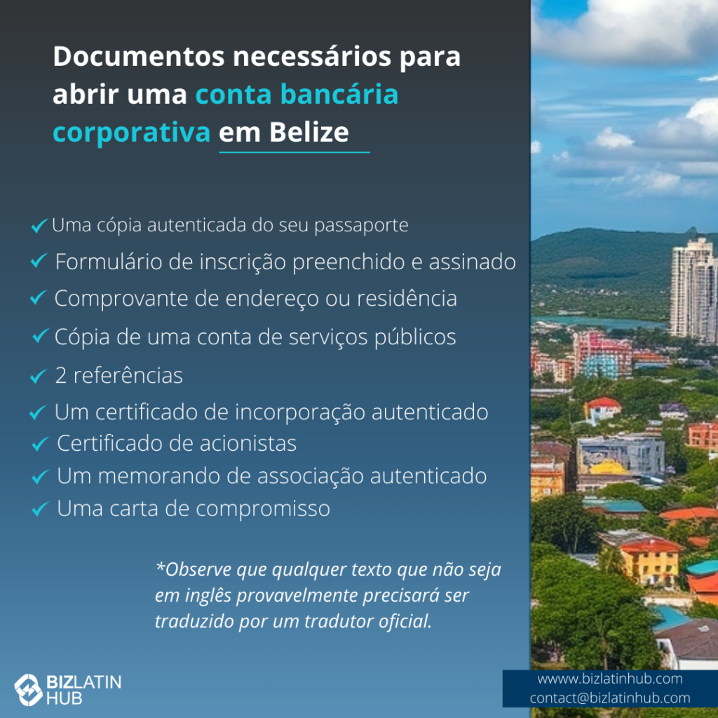 Para abrir uma conta corporativa em Belize, os investidores estrangeiros precisarão apresentar os seguintes documentos:
