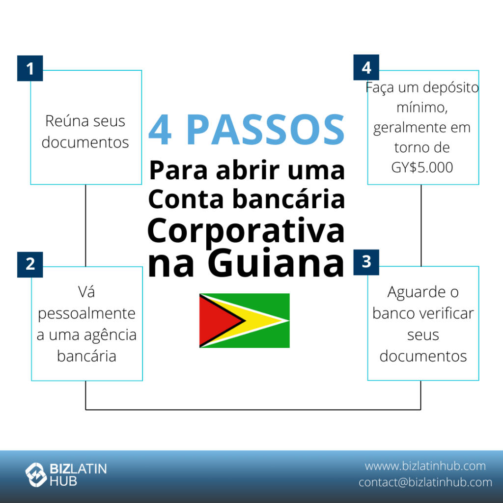 Depois de escolher um provedor de serviços bancários, você estará pronto para iniciar o processo de abertura de uma conta corporativa. Para abrir uma conta bancária na Guiana, você deve seguir estas etapas: