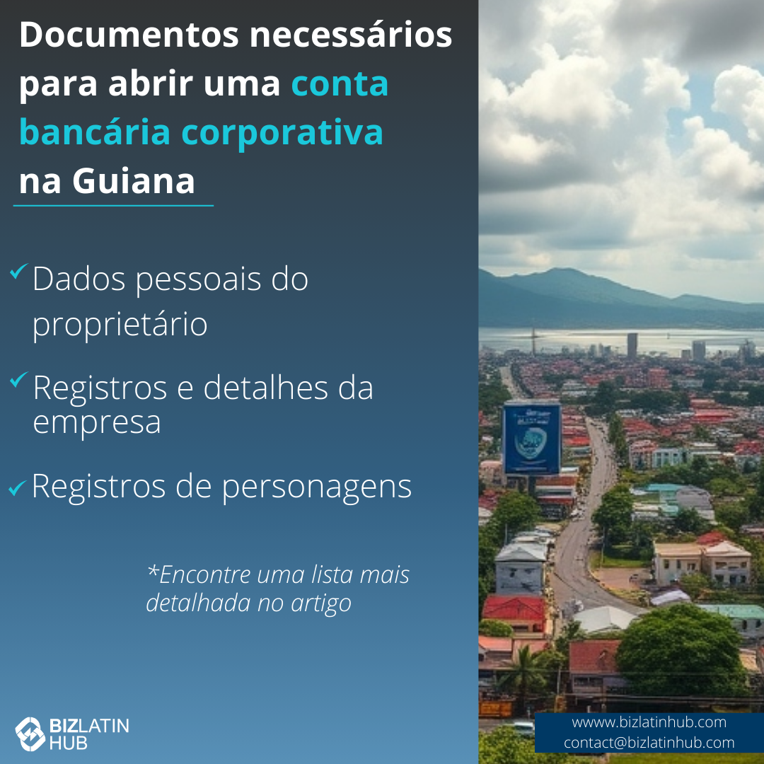 Quais são os documentos necessários para abrir uma conta bancária corporativa na Guiana? | Uma lista grande, veja abaixo os detalhes completos. Inclui: Informações pessoais do proprietário Registros e detalhes da empresa Registros de personagens |