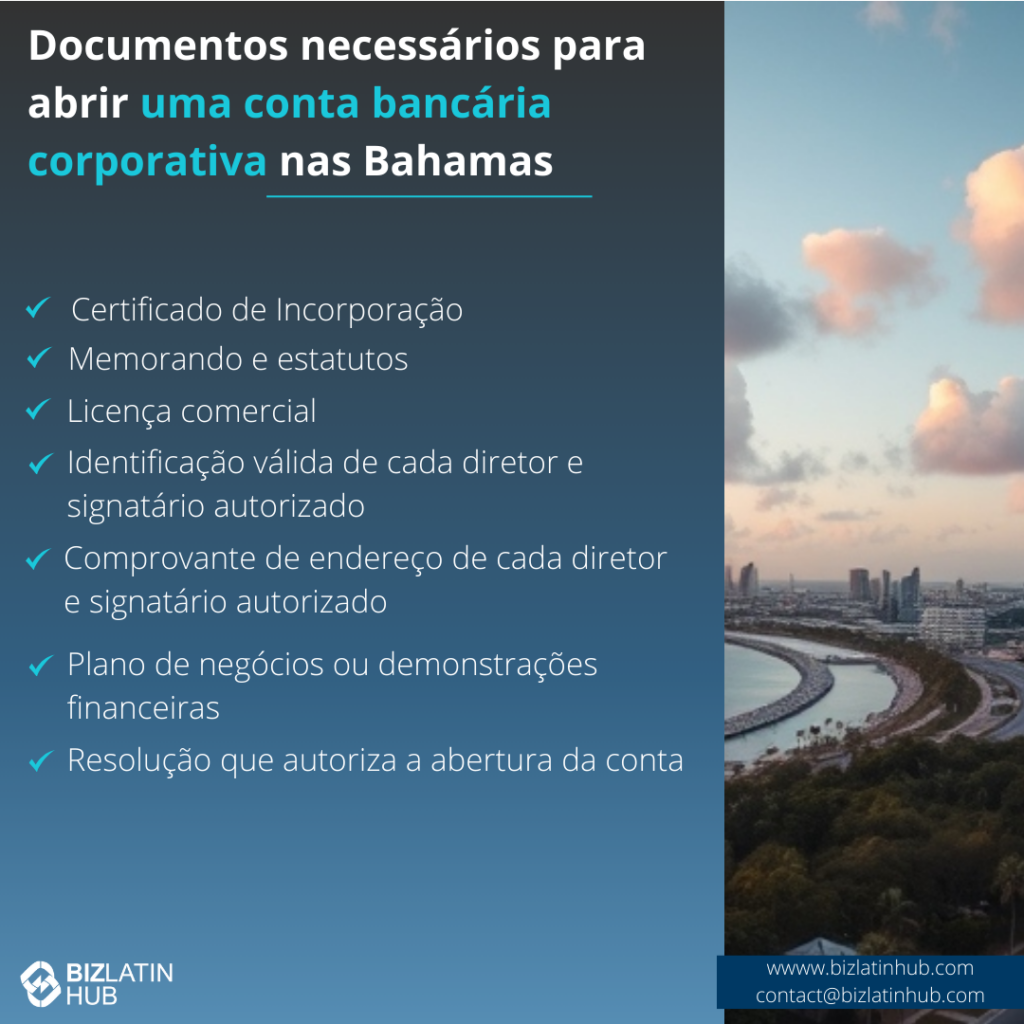Os documentos necessários para abrir uma conta bancária de empresa nas Bahamas podem variar de acordo com o banco, mas normalmente incluem: