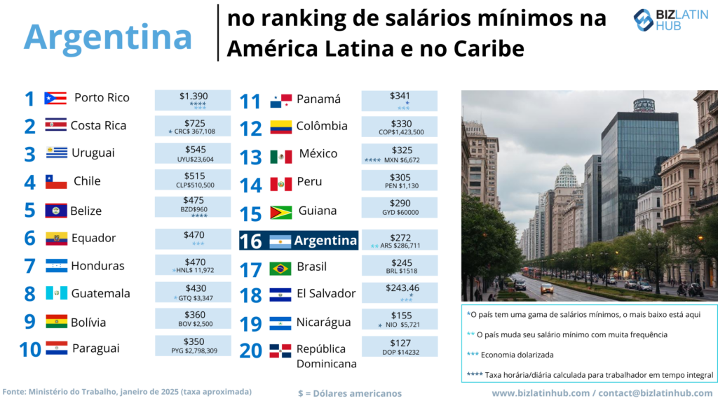 Qual é o salário mínimo na Argentina? | O salário mínimo atual em janeiro de 2025 é de ARS$ 286.711,00. Esse valor muda com frequência, mas geralmente gira em torno de US$ 300. |