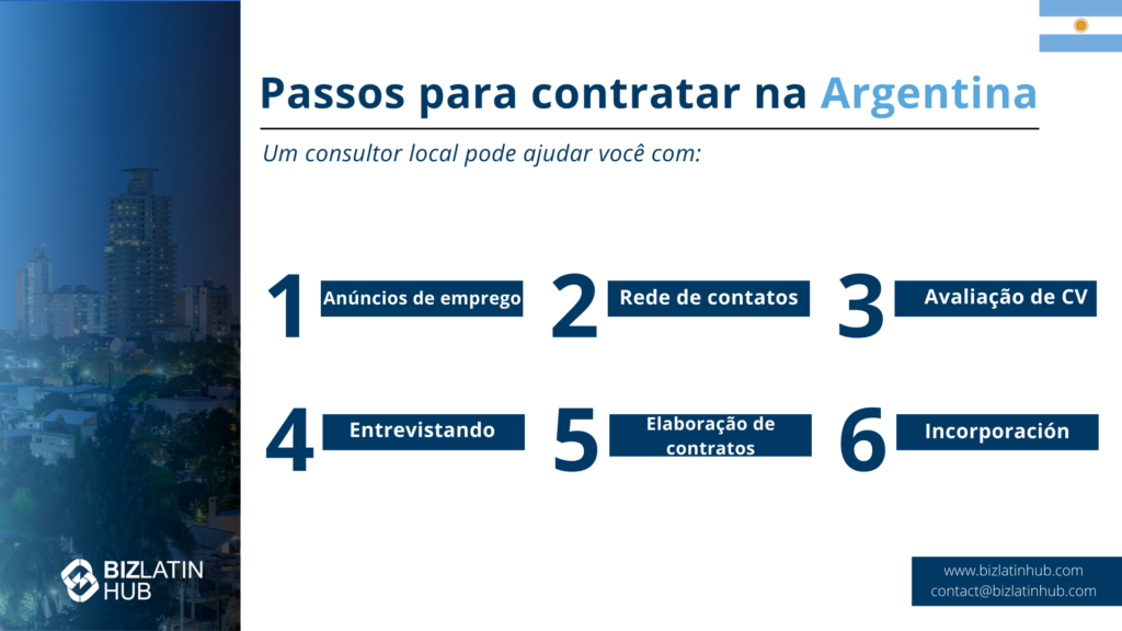 6 passos para contratar pessoal na Argentina | Um consultor local pode ajudar você com: Etapa 1: Anúncios de emprego Etapa 2: Networking Etapa 3: Avaliação do CV Etapa 4: Entrevistas Etapa 5: Redação do contrato Etapa 6: Integração |
