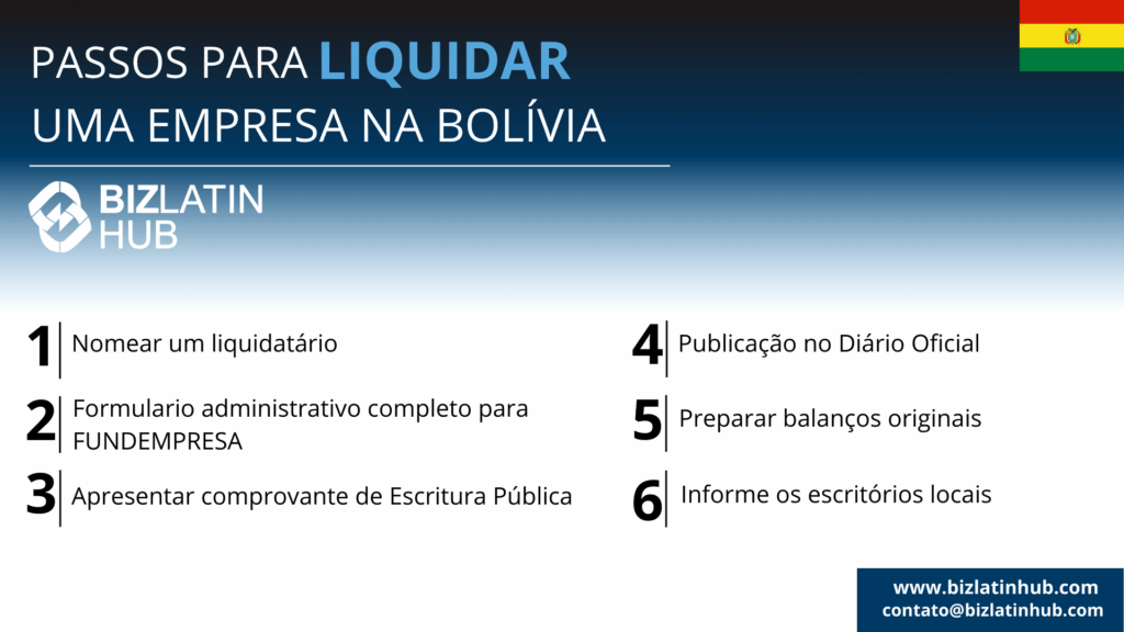 6 etapas para liquidar uma empresa na Bolívia | 1. Nomear um liquidante. 2. Preencher o formulário administrativo da FUNDEMPRESA. 3. Apresentar comprovante de escritura pública. 4. Publicação no Diário Oficial 5. Preparar os balanços originais. 6. Informar os escritórios locais. |