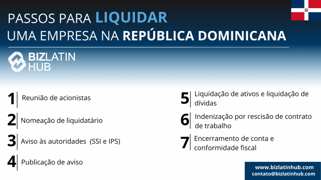 7 etapas para liquidar uma empresa na República Dominicana | Assembleia de Acionistas Nomeação do Liquidante Notificação às Autoridades Publicação da Notificação Liquidação de Ativos e Liquidação de Dívidas Liquidação de Funcionários Encerramento de Contas e Conformidade Fiscal |