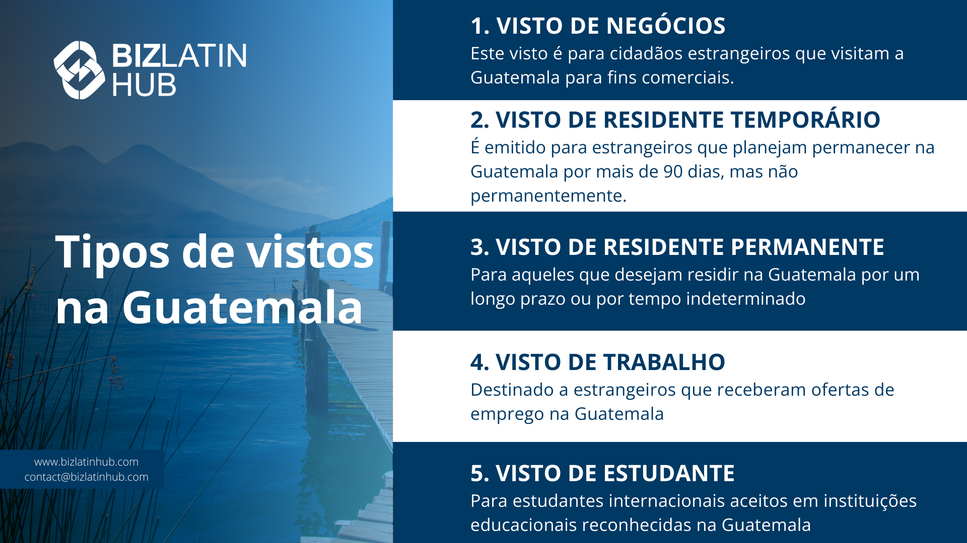 Há muitos tipos diferentes, mas essencialmente se dividem em subclasses de Residência Temporária e Permanente. O visto de negócios na Guatemala é considerado o primeiro.
