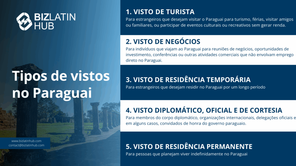 Os vistos de negócios no Paraguai são chamados de vistos de negócios e turismo e também de residência temporária e permanente.