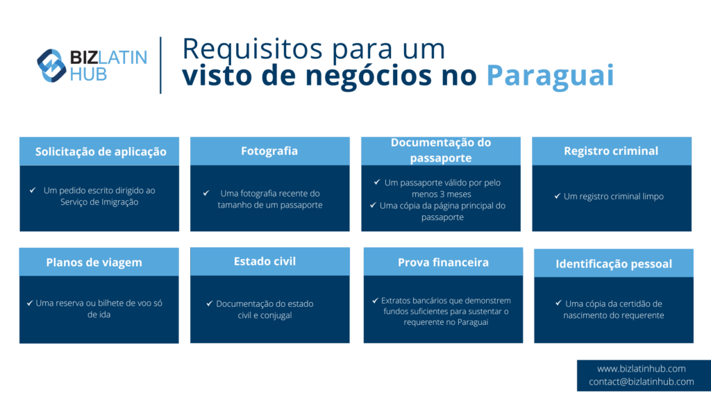 Os requisitos para um visto de negócios no Paraguai incluem: