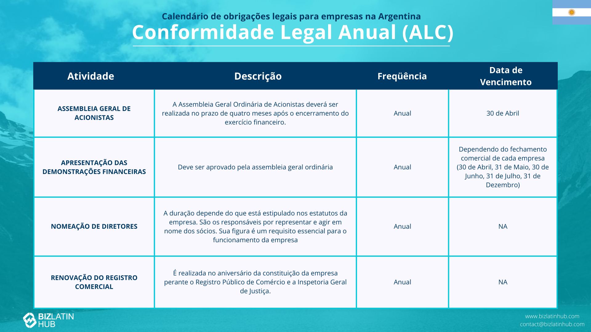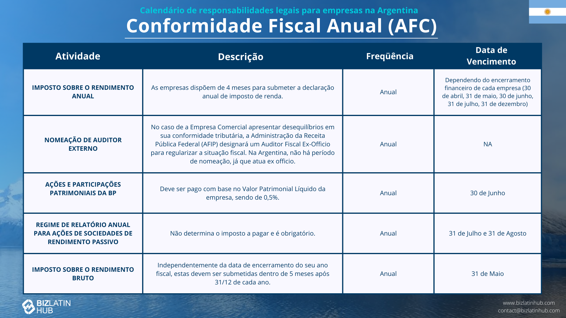 As coisas que você deve fazer anualmente para estar em conformidade com a legislação argentina estão resumidas aqui: