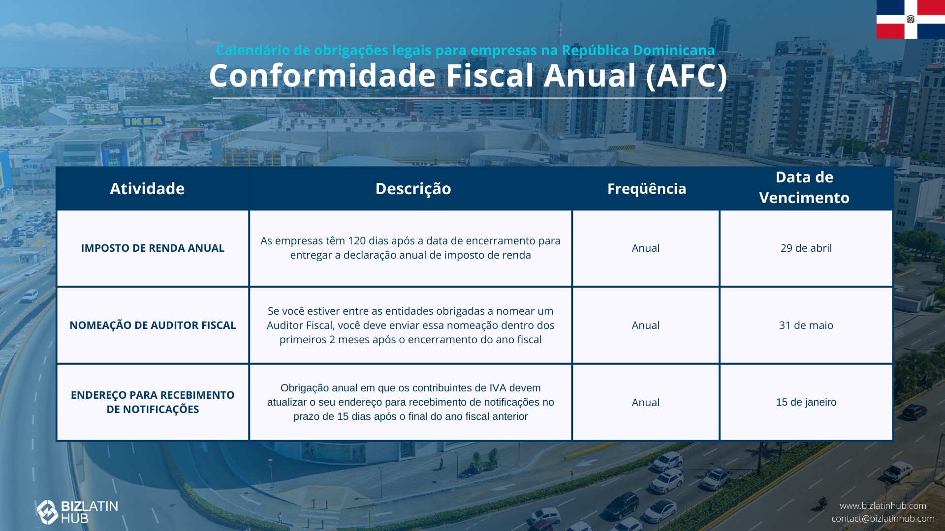 As empresas têm 120 dias após a data de fechamento para apresentar uma declaração anual de imposto de renda até o prazo final de 29 de abril na República Dominicana.