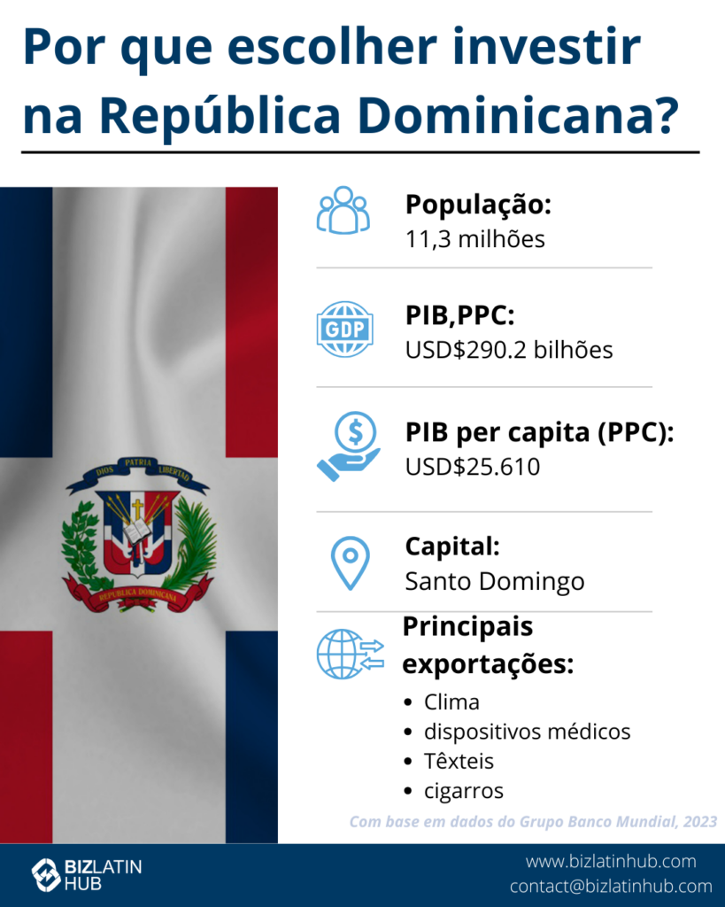 Por que investir na República Dominicana? | Sua localização estratégica e a diversidade de setores, incluindo agricultura, manufatura e serviços, atraem investidores. |