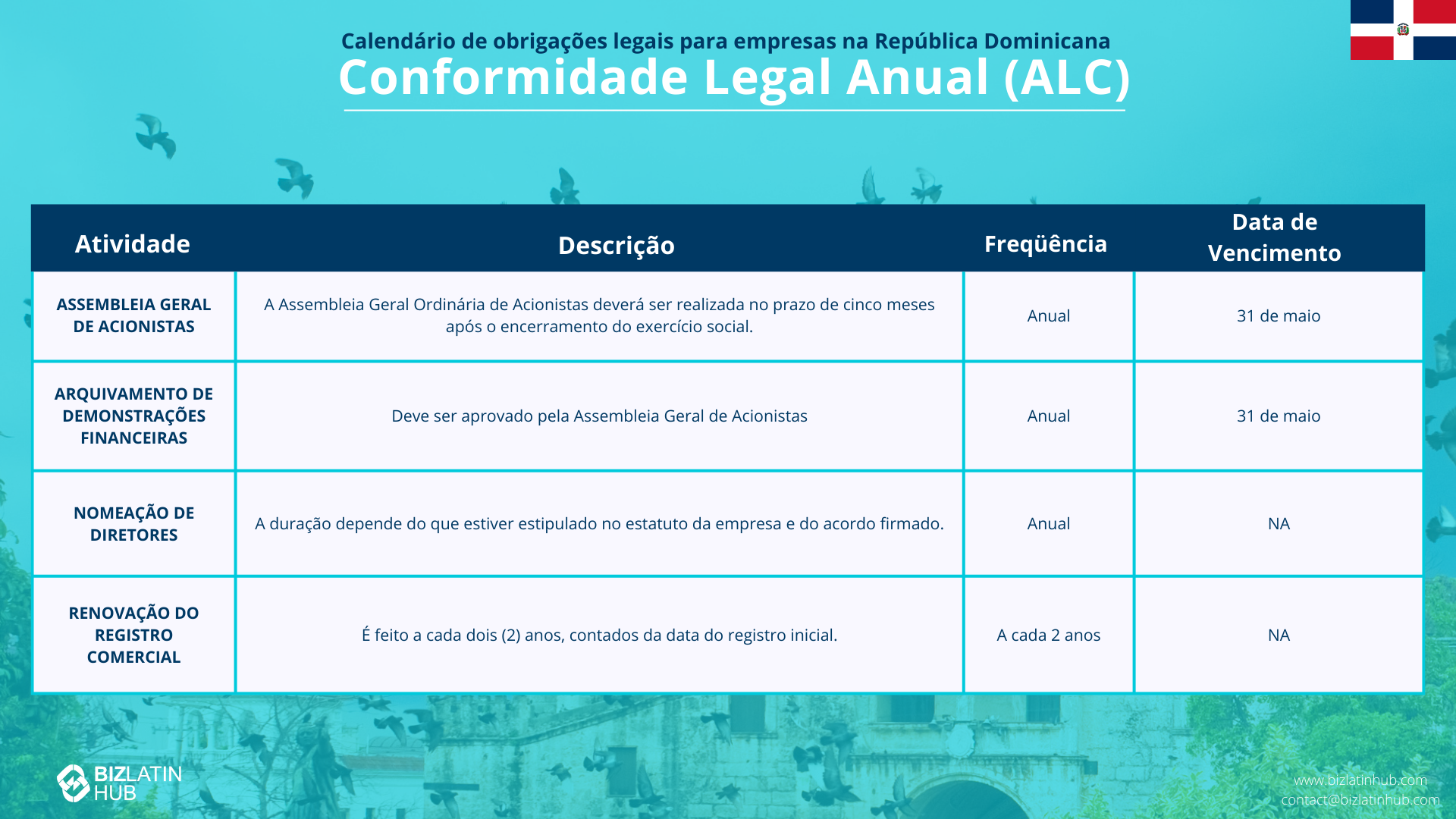 A Assembleia Geral Ordinária de Acionistas deve ser realizada dentro de cinco meses após o encerramento do ano fiscal e até o prazo final de 31 de maio na República Dominicana.