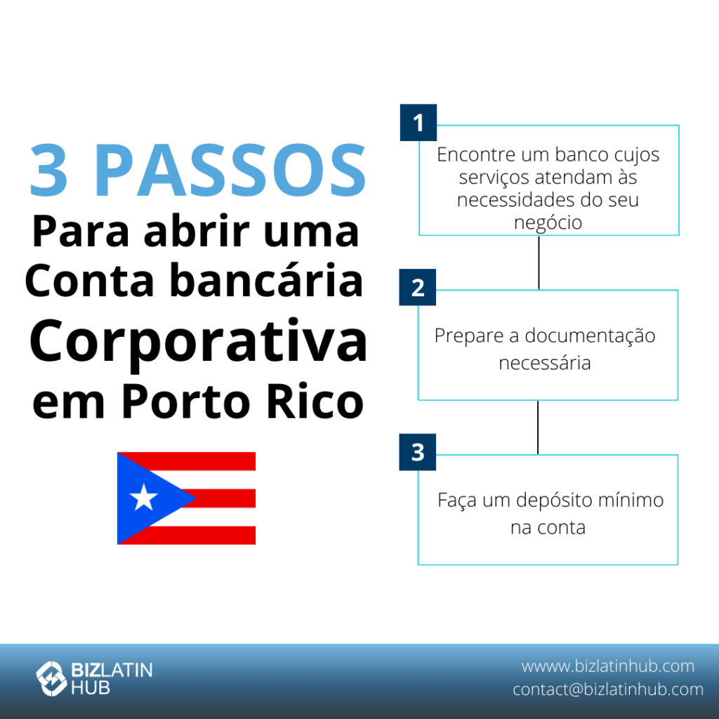 O processo para abrir uma conta bancária corporativa em Porto Rico: | Etapa 1 – Encontre um banco cujos serviços atendam às necessidades de sua empresa. Etapa 2 – Prepare a documentação necessária. Etapa 3 – Faça um depósito mínimo na conta. |