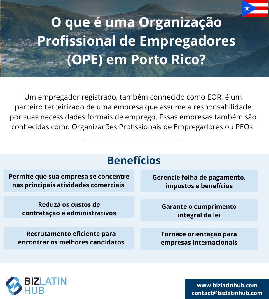 A PEO em Porto Rico (organização profissional de empregadores) é uma organização terceirizada que fornece serviços abrangentes de RH (recursos humanos) para empresas. Os PEOs atuam como co-empregadores, compartilhando as responsabilidades de empregador com a empresa cliente.