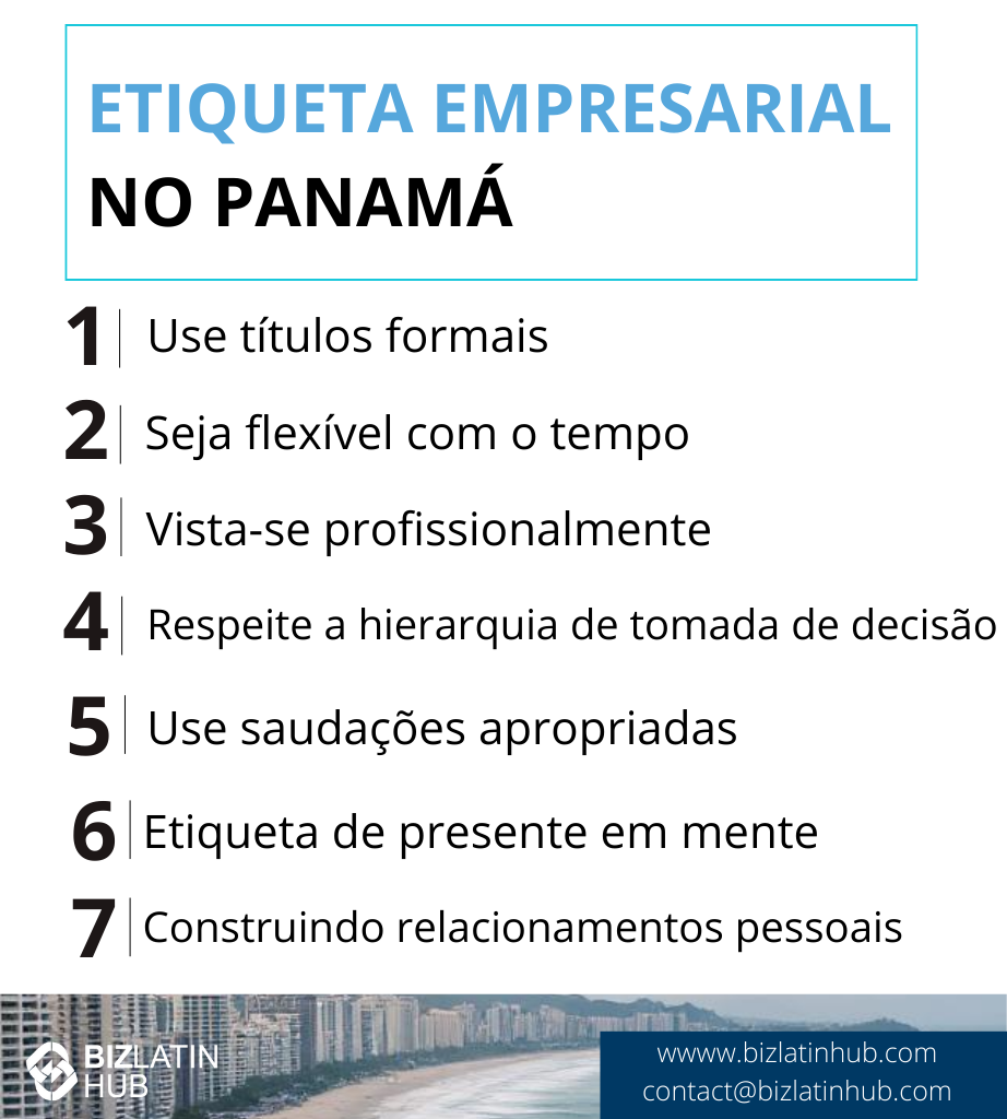 Para obter orientação adicional, considere entrar em contato com a Câmara de Comércio do Panamá ou com consultores de negócios locais que possam fornecer informações mais específicas para o seu setor. A participação regular em eventos de networking de negócios também pode ajudar você a criar conexões valiosas enquanto pratica esses protocolos culturais.