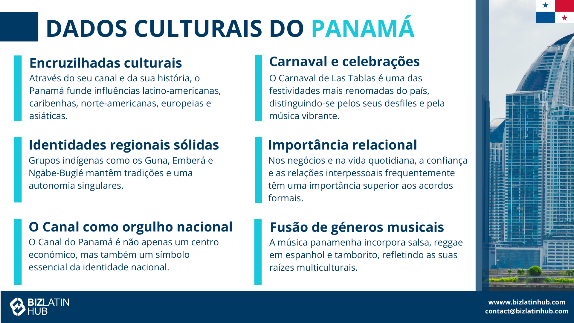 As operações da Biz Latin Hub na Cidade do Panamá nos permitem fornecer orientação privilegiada sobre como navegar pelos costumes e práticas profissionais locais.