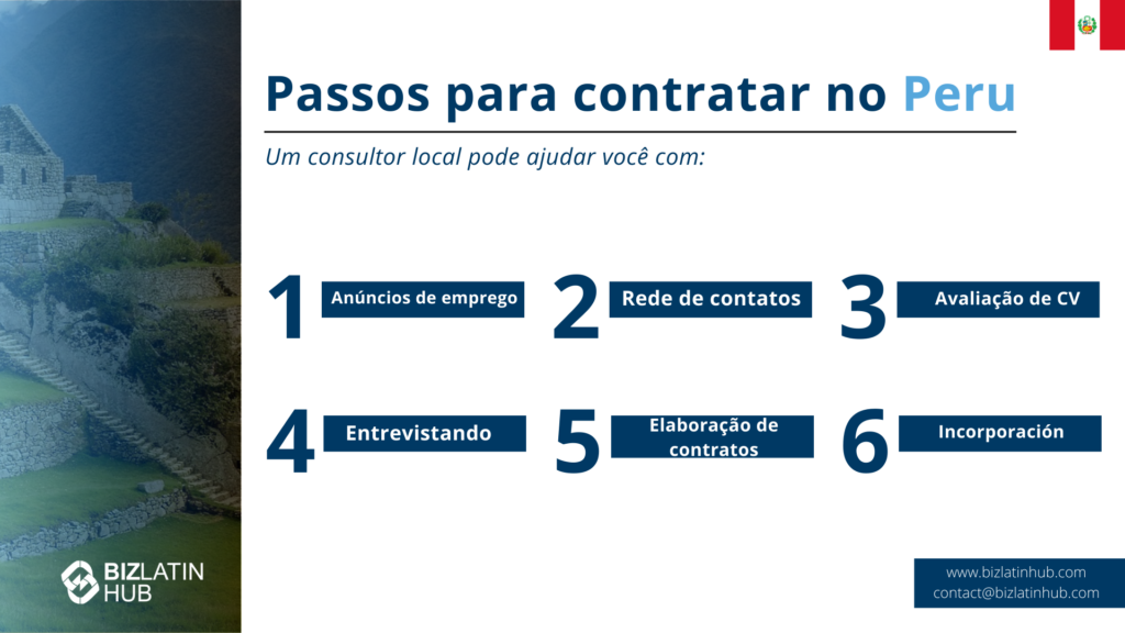Passos para contratar no PeruUm consultor local pode ajudar você com: