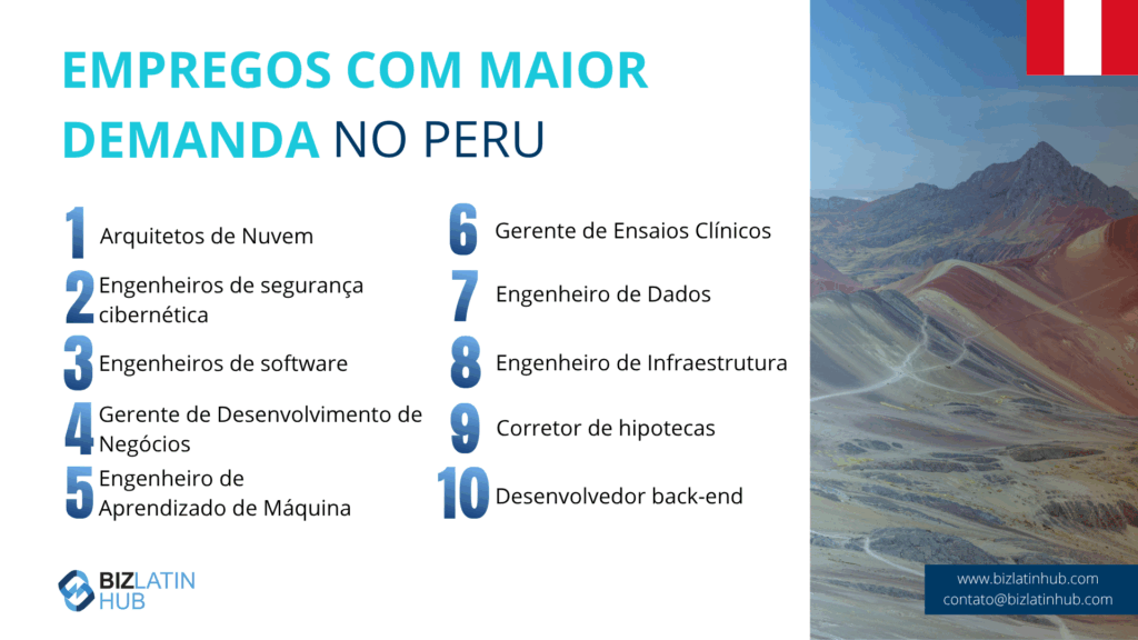 Quais são os principais cargos para contratação no Peru?Os principais setores no Peru incluem tecnologia, especialmente: