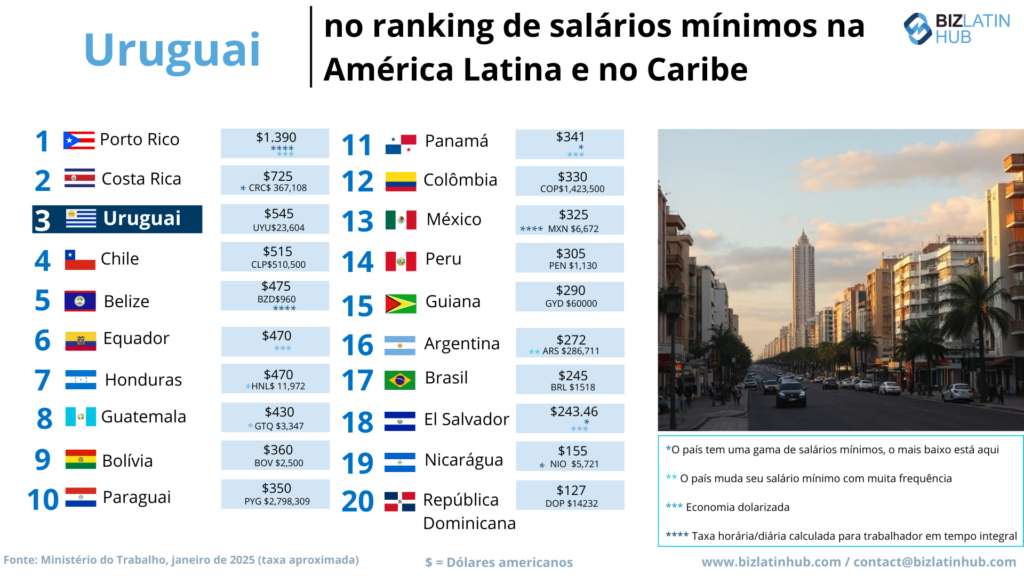 Qual é o salário mínimo no Uruguai? | O salário mínimo mensal atual, em janeiro de 2025, é de $U23.604 (aproximadamente US$ 545) |