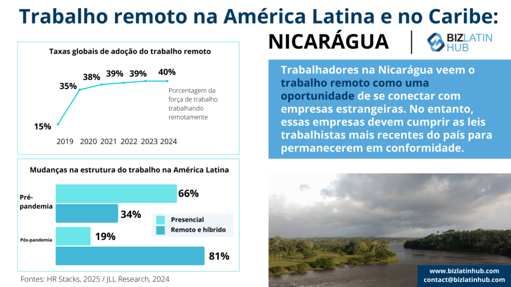 A Nicarágua tem padrões trabalhistas específicos que devem ser seguidos por empregadores e empregados. A semana de trabalho é limitada a 48 horas ou oito horas por dia. Essa regra garante a conformidade com as leis trabalhistas. Os empregadores devem fornecer contratos de trabalho por escrito antes de o funcionário começar a trabalhar. Os funcionários recebem 15 dias de licença remunerada a cada seis meses. Essa licença geralmente precisa ser tirada em um período contínuo. Um Employer of Record (EOR) pode ajudar as empresas na Nicarágua. Os serviços do EOR simplificam a contratação. Eles lidam com tarefas como contratos de trabalho e obrigações fiscais.