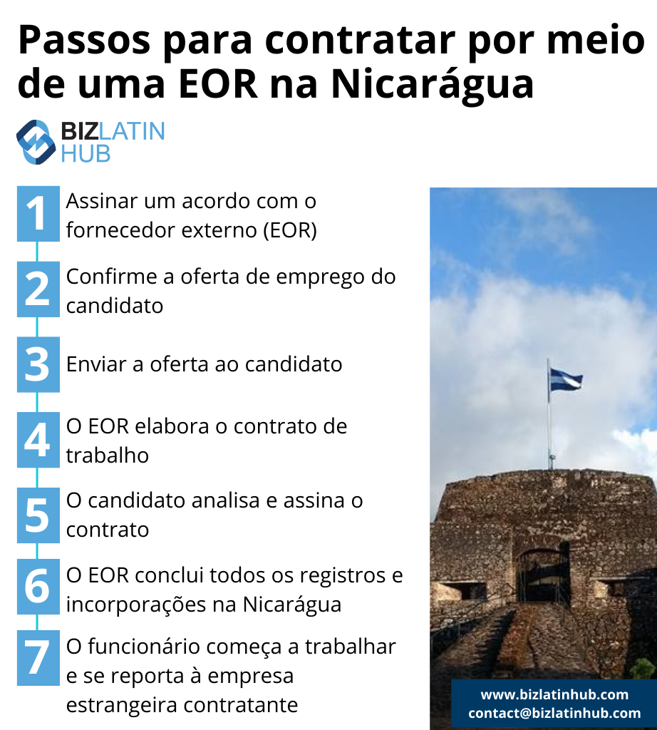 Dica importante: Embora uma EOR ofereça uma solução de entrada rápida, estabelecer uma entidade legal e trabalhar com um PEO normalmente oferece maior controle, eficiência de custos a longo prazo, redução do risco de estabelecimento permanente, posição legal mais sólida e melhor atração de talentos na Nicarágua. A Biz Latin Hub oferece soluções EOR e PEO, ajudando as empresas a navegar pelas regulamentações específicas da Nicarágua (incluindo a semana de trabalho de 48 horas, 15 dias obrigatórios de licença remunerada a cada seis meses e requisitos de seguridade social), estabelecer entidades e garantir a conformidade total de RH. Se você precisa de uma entrada rápida no mercado ou de uma presença estável a longo prazo, podemos orientá-lo durante todo o processo.