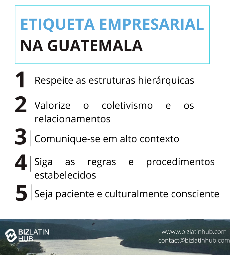 Quão formal é a cultura empresarial da Guatemala? | Certifique-se de que você respeita o status social e se comporta de maneira formal e profissional. |
