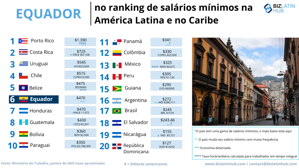 Qual é o salário mínimo no Equador? | O salário mínimo atual, a partir de janeiro de 2025, é de US$ 470. No entanto, há exceções em determinados setores. |