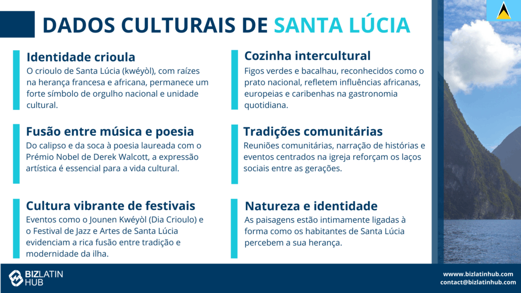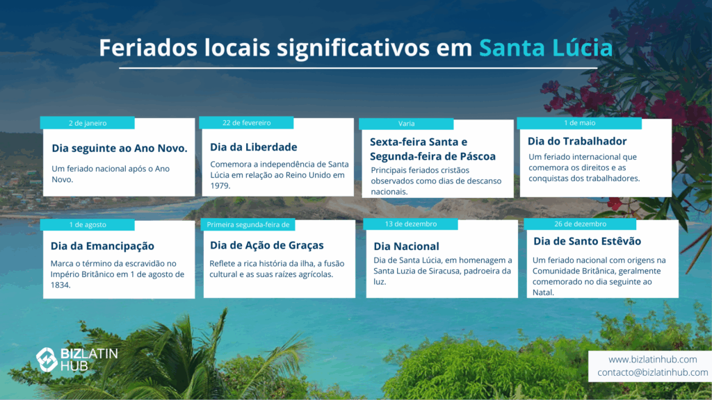 Em Santa Lúcia, fortes conexões pessoais são vitais para o sucesso dos negócios. Os profissionais costumam socializar fora das reuniões para conhecer seus parceiros.