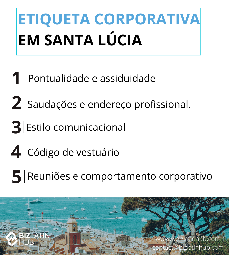 As reuniões em Santa Lúcia misturam formalidade e descontração. Entender os costumes locais ajuda a atingir as metas de negócios. O ambiente valoriza a pontualidade, o profissionalismo e a cordialidade.