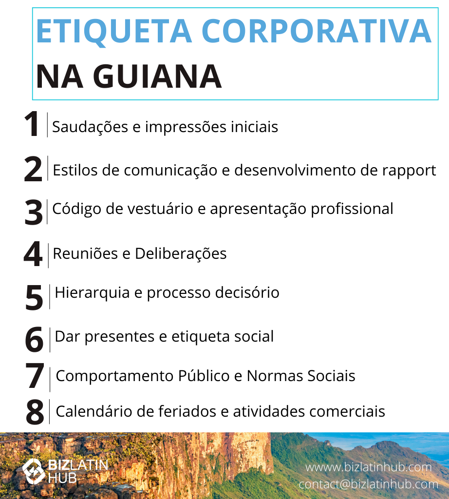 A pontualidade é importante na Guiana? | A pontualidade é apreciada, embora o “horário da Guiana” possa ser aplicado – chegue cedo para demonstrar respeito e prontidão. |