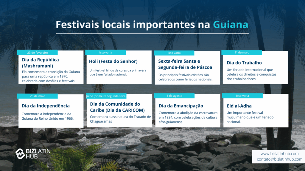 A Guiana tem uma grande variedade de feriados legais. As empresas, especialmente os escritórios do governo e os bancos, podem fechar nesses dias: