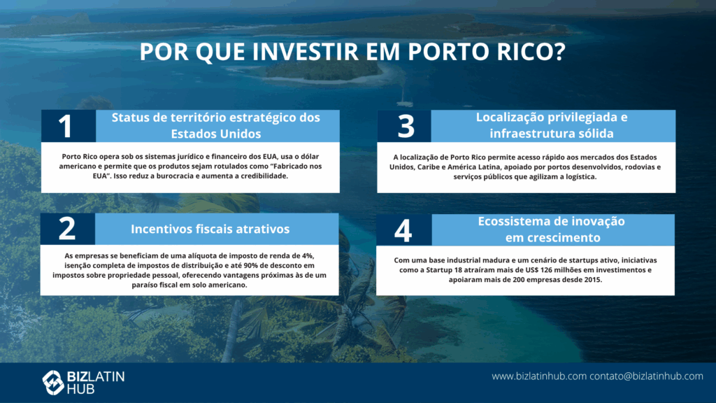 Quais são as principais vantagens de fazer negócios em Porto Rico? | A ilha faz parte dos EUA, o que significa que o dólar americano é a moeda oficial, eliminando o risco cambial. Você também conta com benefícios fiscais significativos. |