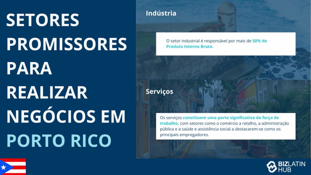 Setores mais importantes em Porto Rico | O setor industrial é responsável por mais de 50% do PIB, enquanto o setor de serviços representa a maior parte do restante. Produtos farmacêuticos, equipamentos médicos, computadores e vestuário são alguns dos principais produtos de exportação produzidos em Porto Rico, juntamente com peixe e rum |