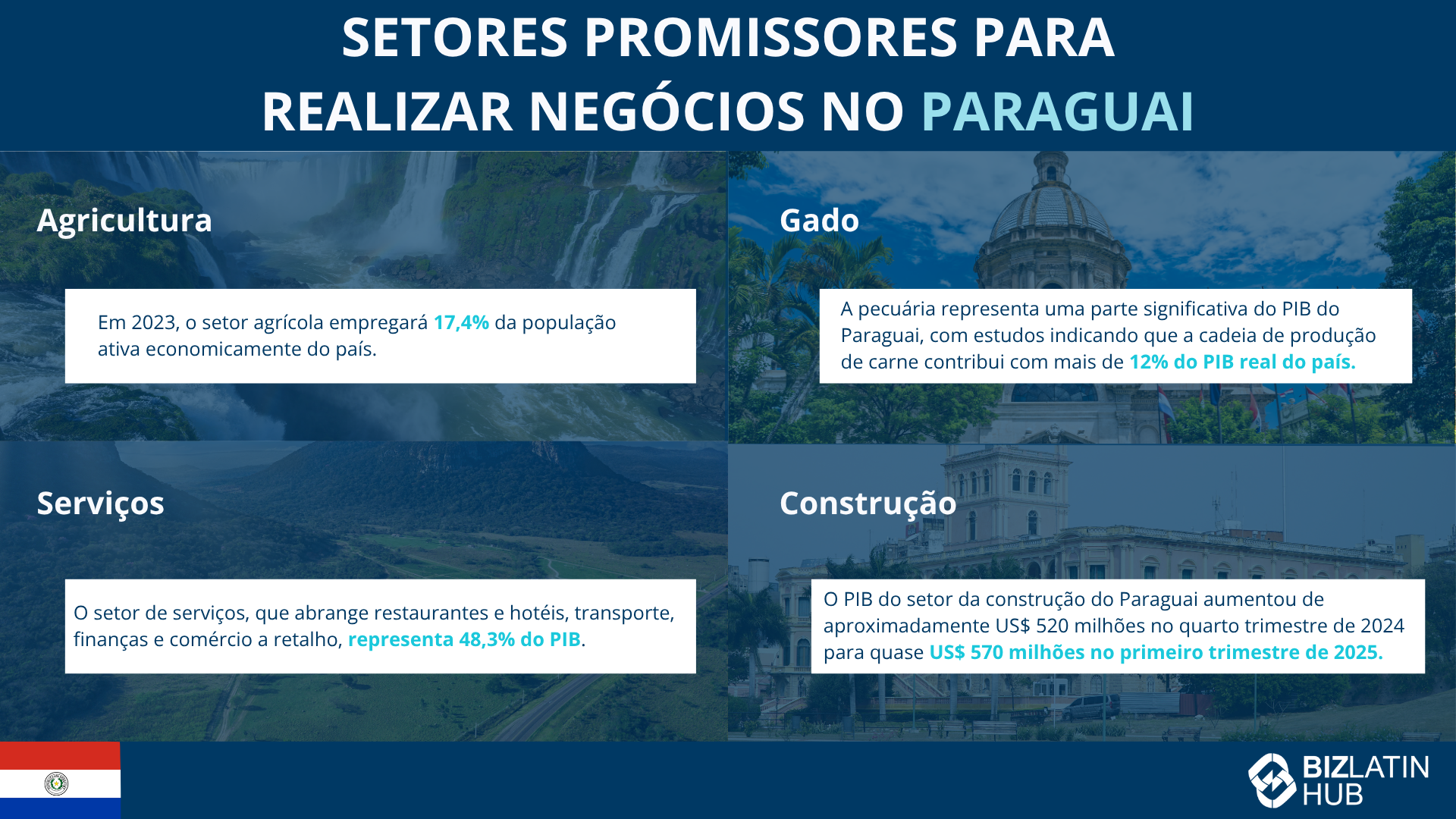 Setores mais importantes no Paraguai | Os principais impulsionadores de sua economia são a agricultura, a pecuária, o varejo e a construção. |