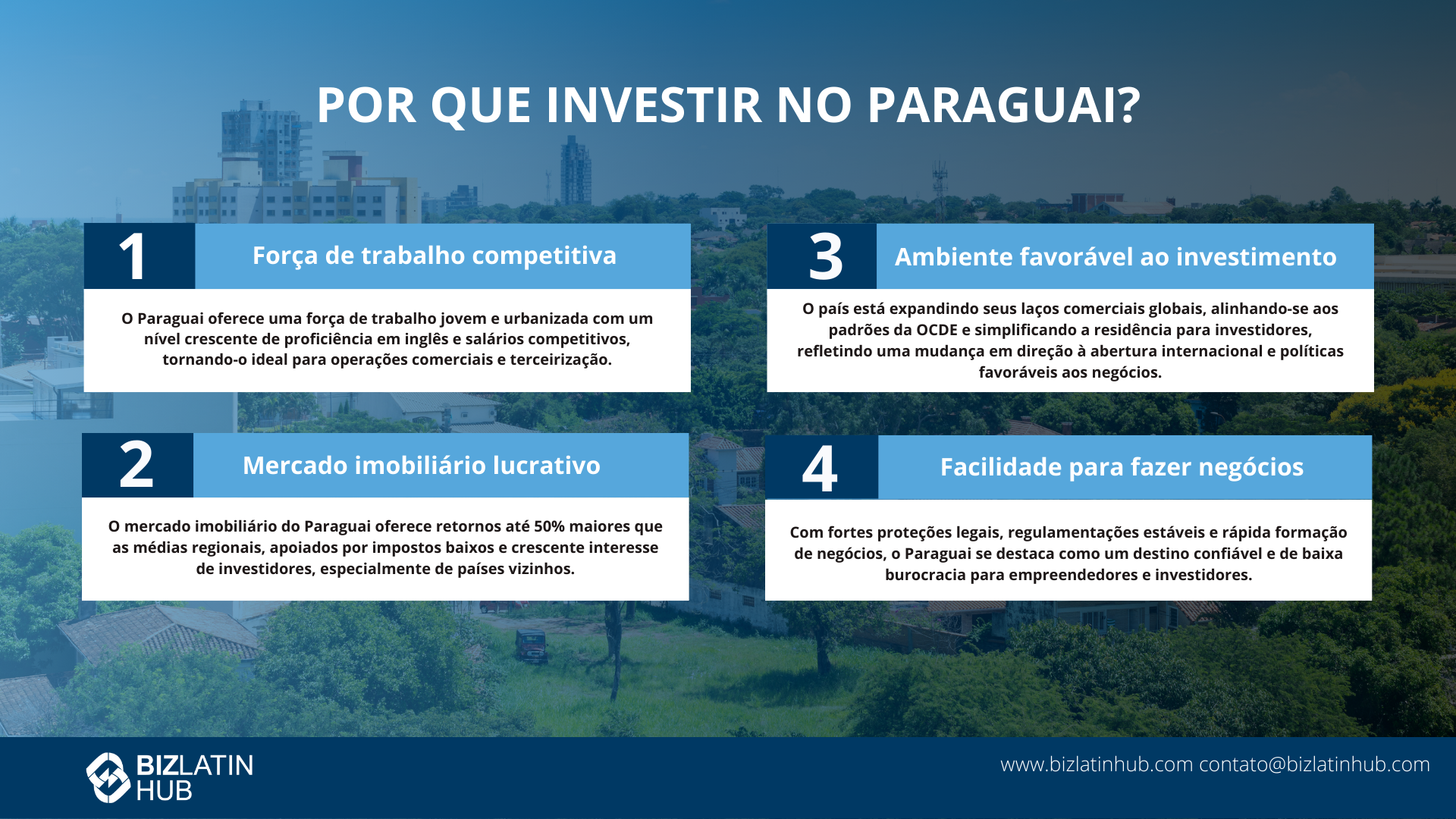 Se você está pensando em a formação de uma empresaou registrando uma filial, ou se você simplesmente deseja fazer negócios no Paraguai, continue lendo para descobrir como as oportunidades de residência e o regime tributário do país podem ser benéficos para você. O país é um membro fundador do Mercosul, o que lhe dá acesso a portos para exportação e diminui o impacto de não ter acesso ao mar. Fazer negócios no Paraguai já é atraente e parece que vai se fortalecer.