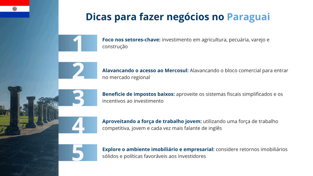 Além disso, o Paraguai viu a proficiência em inglês aumentar nos últimos anos e agora está entre as cinco principais nações da região em termos de proficiência em inglês, o que o torna ainda mais atraente para fazer negócios.
