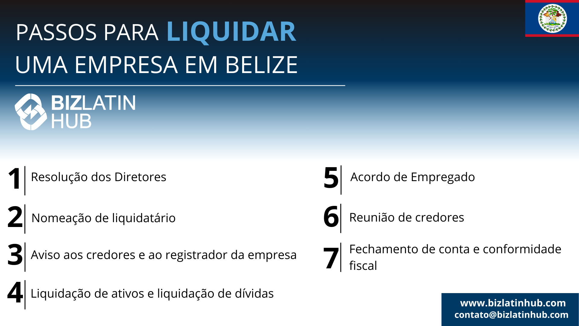 7 etapas para liquidar uma empresa em Belize | Etapa 1: Criar um Plano de Liquidação Etapa 2: Aprovar uma Resolução de Acionistas Etapa 3: Apresentar uma Notificação ao Registrador Etapa 4: Nomear um Liquidante Licenciado Etapa 5: Resolver os Assuntos da Empresa Etapa 6: Apresentar Artigos de Dissolução |