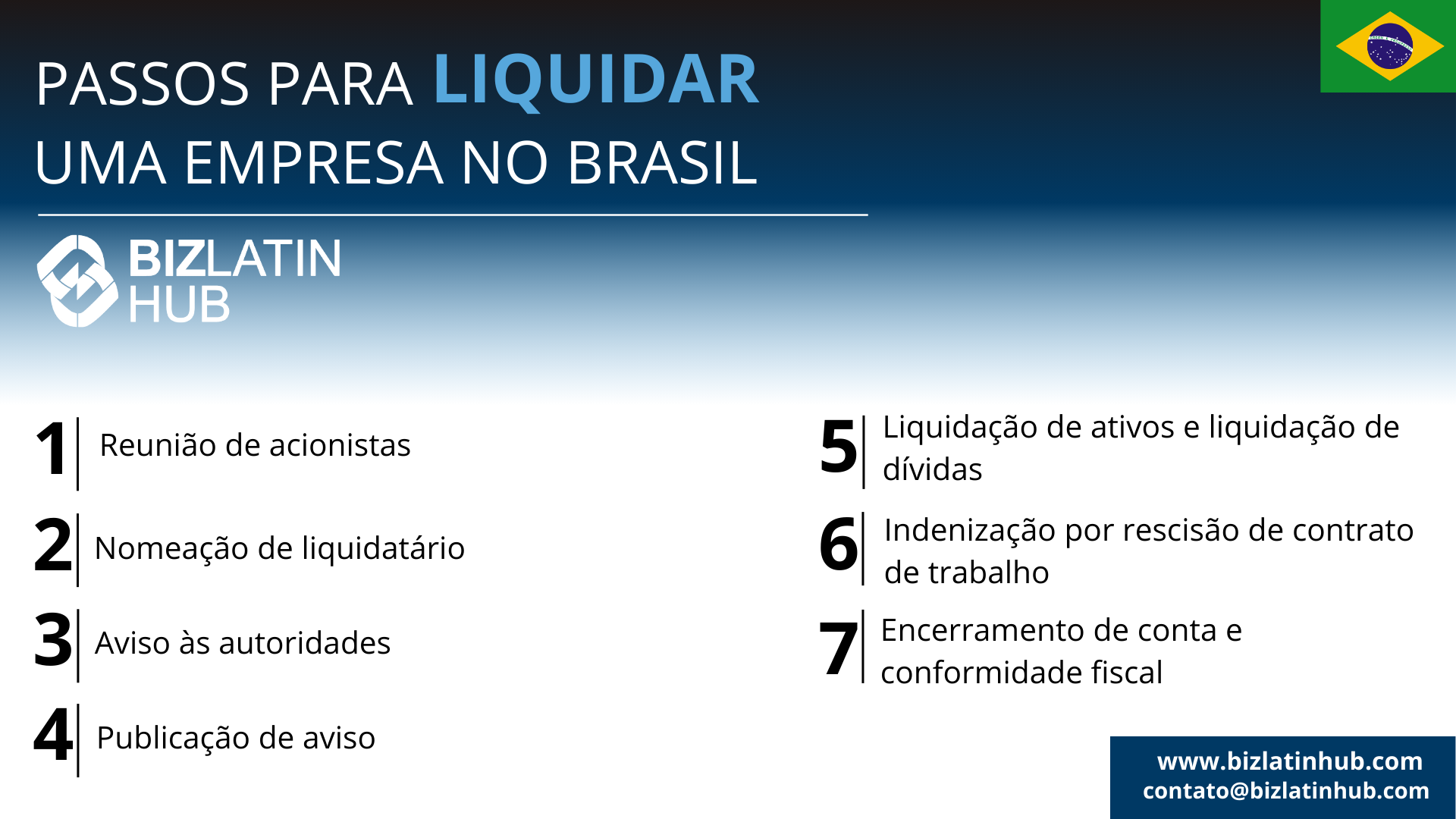 7 passos para liquidar uma empresa no Brasil | Assembleia de acionistas Nomeação de liquidante Aviso às autoridades Publicação de aviso Liquidação de ativos e liquidação de dívidas Liquidação de funcionários Encerramento de contas e conformidade fiscal |