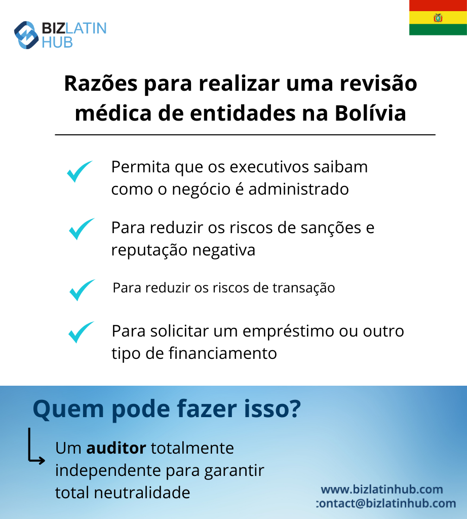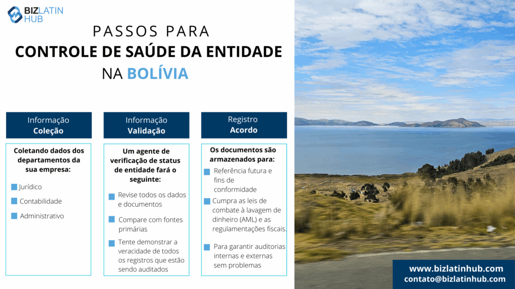 Um exame de saúde de uma entidade é uma auditoria realizada por um terceiro para verificar sua conformidade corporativa local. Uma verificação da saúde da entidade na Bolívia envolve a verificação de que os administradores e funcionários da empresa estão cumprindo as obrigações legais e fiscais.