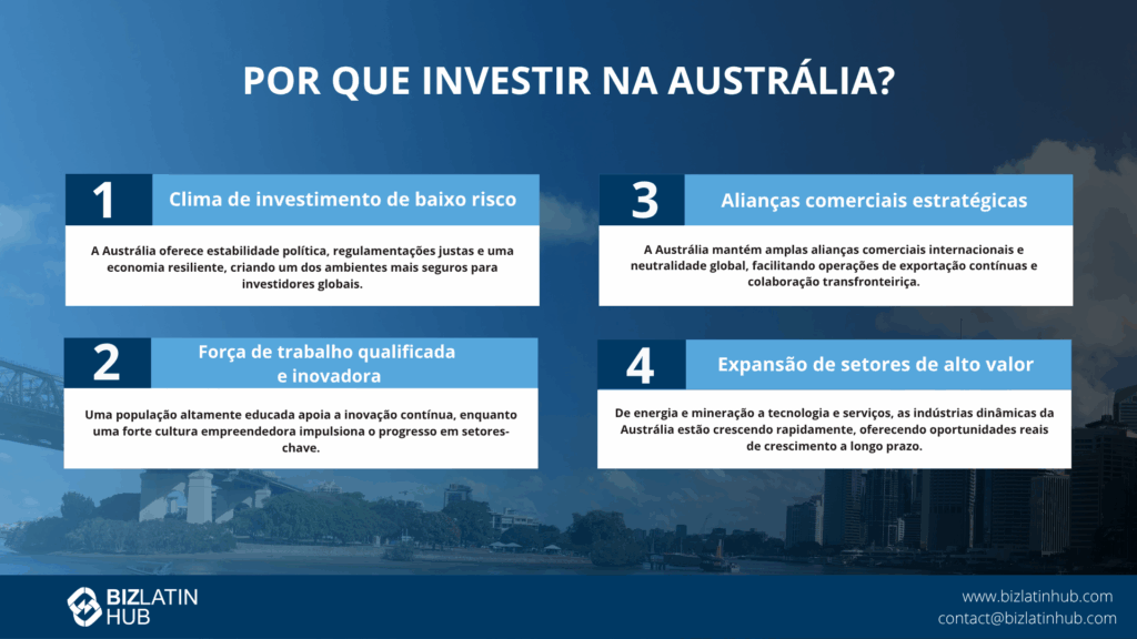 A Austrália é uma das principais economias do mundo, além de ser um dos destinos mais atraentes para investimentos estrangeiros. Com um crescimento consistente do PIB por 29 anos consecutivos, não é de se admirar que os investidores sejam atraídos para a formação de empresas na Austrália. De modo geral, o país está fazendo grandes avanços em vários setores e indústrias diferentes. A Austrália está se expandindo e se desenvolvendo em âmbito mundial. Os investidores estrangeiros interessados no país, ou que buscam aumentar seus investimentos atuais, devem prestar muita atenção aos setores em ascensão.
