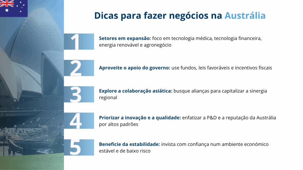 Por fim, várias alianças econômicas e parcerias comerciais estimulam os esforços de exportação e colaboração. A Austrália é vista como uma potência bastante neutra em todo o mundo, o que é um bom presságio para os negócios e para os setores em constante expansão. Os investimentos têm uma boa chance de sucesso na Austrália.