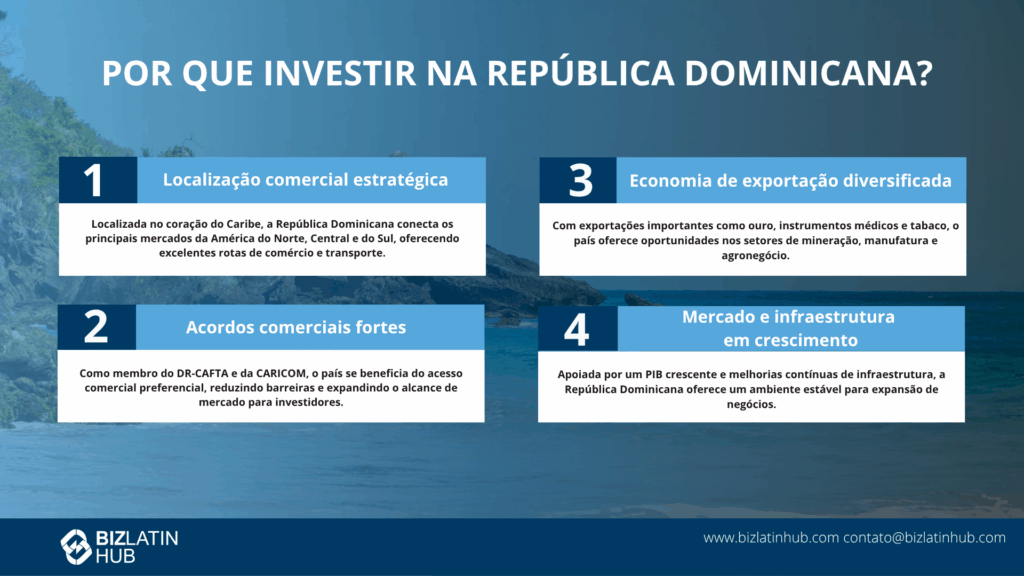 Fazer negócios na República Dominicana em 2025 oferece uma série de vantagens para empresas internacionais, desde zonas de livre comércio e incentivos fiscais até a crescente demanda dos consumidores e o acesso à logística regional. Continue lendo para saber mais sobre os benefícios de fazer negócios na República Dominicana e por que você deve considerar a expansão para esse país caribenho. A Biz Latin Hub pode ajudar você a incorporar uma empresa na República Dominicana ou em qualquer outro lugar da região. As empresas que desejam fazer negócios na República Dominicana devem entender as regulamentações locais, os benefícios do sistema de zona franca e as etapas práticas necessárias para a constituição de uma empresa.