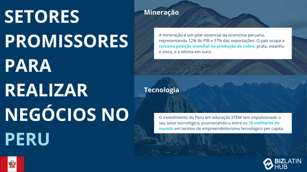 Setores mais importantes no Peru | Historicamente, a mineração sempre foi um dos setores mais fortes da economia do Peru. No entanto, os serviços, especialmente os de tecnologia, estão ganhando importância rapidamente. |