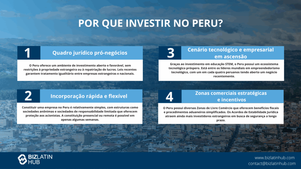 Recentemente, também foi aprovada uma legislação que facilita o investimento estrangeiro e garante que as empresas estrangeiras e locais sejam tratadas com igualdade. Além disso, a constituição de uma empresa no Peru é um processo relativamente simples. Vale a pena explorar todas essas condições altamente competitivas para que você aproveite ao máximo o que essa nação em crescimento tem a oferecer.