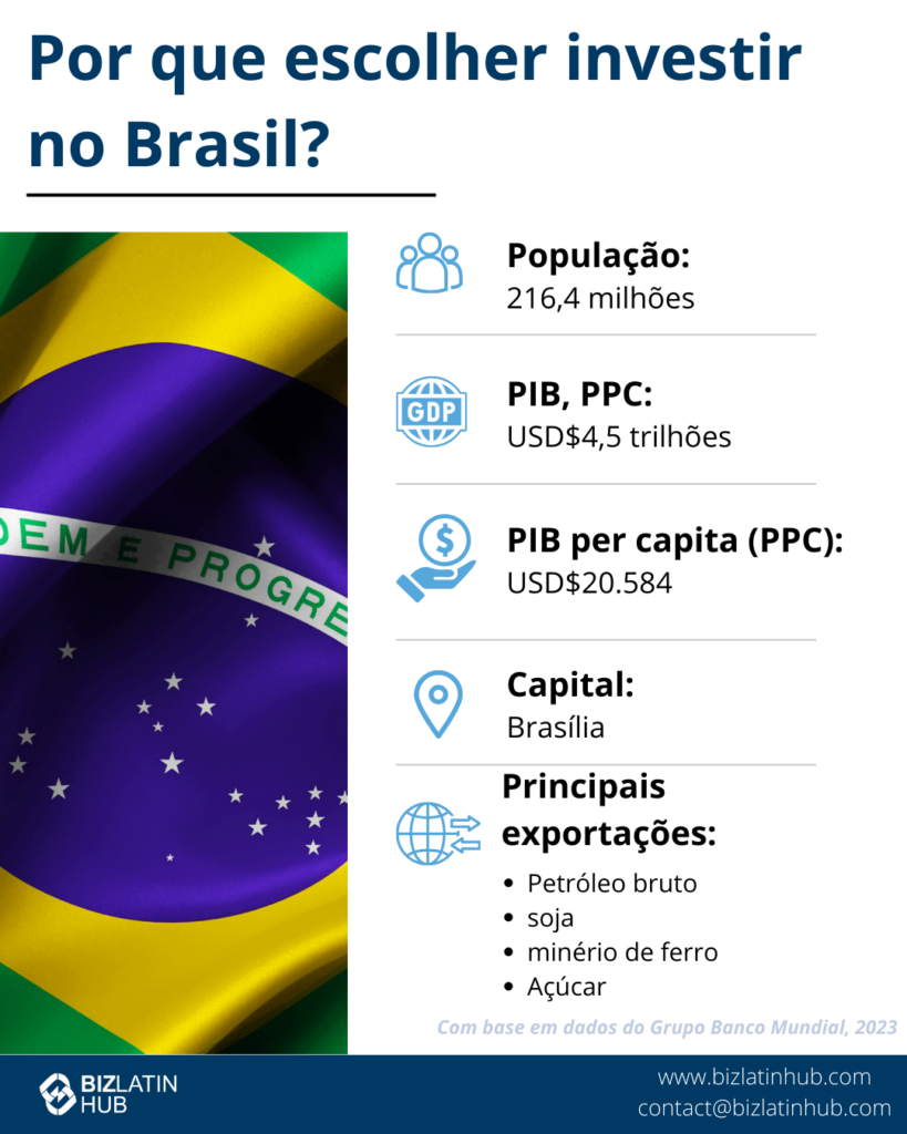 Por que investir no Brasil? | O Brasil continua a liderar como a maior economia da América Latina, com setores em crescimento na agricultura, energia, tecnologia e manufatura. |