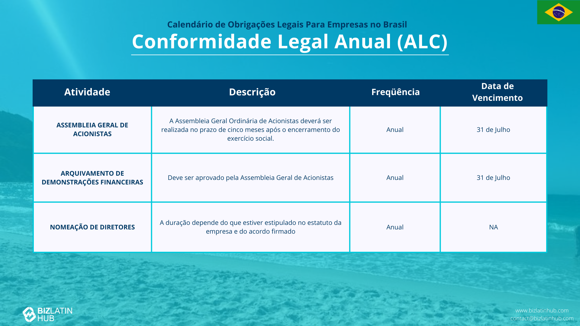 Qualquer empresa no Brasil, independentemente do tipo de entidade legal, deve cumprir uma série de obrigações regulatórias durante o ano civil. O cumprimento dos requisitos de conformidade corporativa em tempo hábil ajudará sua empresa a gerenciar riscos e evitar responsabilidades.