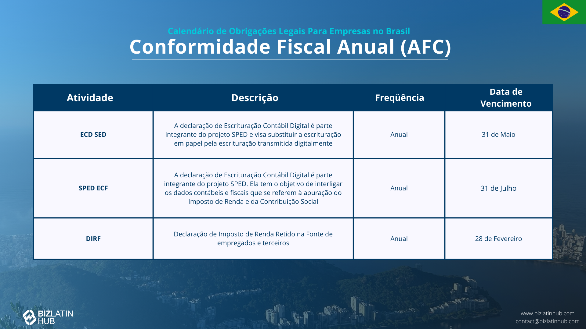 As LLCs brasileiras devem aderir a várias obrigações anuais de conformidade, incluindo o preenchimento dos relatórios SPED ECD (Escrituração Contábil Digital) e SPED ECF (Escrituração Fiscal Digital), o envio da DIRF (Declaração de Imposto de Renda Retido na Fonte) e a realização de uma Assembleia Geral Ordinária (AGO) para aprovar as demonstrações financeiras e discutir assuntos da empresa.