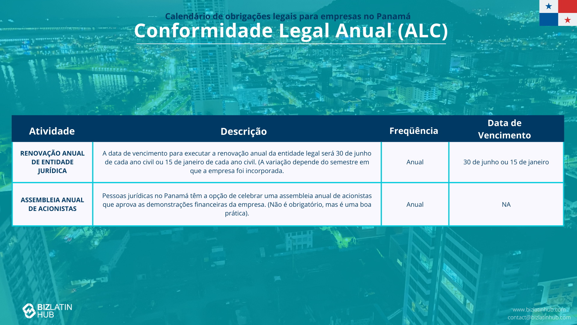 Quais são os requisitos anuais de conformidade legal da entidade? | A data de vencimento para as empresas realizarem a renovação anual da pessoa jurídica no Panamá é 30 de junho ou 15 de janeiro de cada ano civil. Isso depende do semestre em que a empresa foi constituída. As pessoas jurídicas no Panamá têm a opção de celebrar uma assembleia anual de acionistas que aprova as demonstrações financeiras da empresa. Isso não é obrigatório, mas é uma boa prática. |